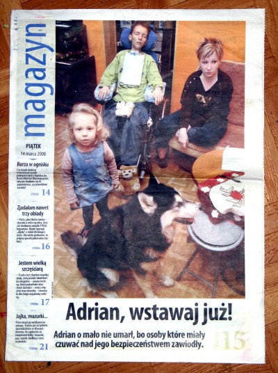 Trudno pogodzić się z tą tragedią. Jej ofiarą padł Adrian, ale dotknęłą ona i zmieniła życie wielu innych osób. Jest dramatem matki, która przeżyła załamanie, sama trafiła do szpitala, a teraz znajduje sie pod stałą opieką psychologa. Jest dramatem Damiana, brata Adriana, który od dnia wypadku zamknął się w sobie i nigdy nie pogodził się z tym co się stało. Jest ciężkim przeżyciem dla szkolnych koleżanek i kolegów Adriana oraz wychowawców. I wreszcie, bez względu na osąd, jest osobistym dramatem dwóch opiekunek, którym można zarzucać wiele, ale nie to, że chciały krzywdy dziecka (w maju 2008 stanęły przed koszalińskim sądem, który warunkowo umorzył postępowanie karne na okres dwóch lat próby). Adrianowi, jego mamie i rodzinie trzeba pomóc. Największą słabością wszystkich akcji charytatywnych jest ich... akcyjność. Jednorazowa akcja przynosi jednorazową korzyść, później zwykle o sprawie zapomina się. Rezultat takiego postępowania jest niekiedy odwrotny od oczekiwanego - rodziny, którym udzielono takiej pomocy, czują się później opuszczone. Dlatego tak ważna jest pomoc stała, trwająca dłużej, niż krótką chwilę, nawet jeśli jej wymiar jest skromniejszy. I dlatego też tak bardzo jest potrzebna pamięć - używając języka sportowego - długodystansowa. Dobrze by się stało, gdyby środowiska sportowe miasta i regionu roztoczyły stałą opiekę nad sportowcem, któremu nie dane było spełnić marzeń o karierze sportowej. My też potrzebujemy Adriana, aby przypominał nam o tym, co jest najważniejsze w sporcie, a o czym często zapominamy - o marzeniach. Marzeniach, które spełniają się wbrew przewidywaniom i największym nawet przeszkodom. Adrian marzył o tym, żeby pojechać na Euro 2012. Czy jego marzenia się spełnią? Sportowcy koszalińscy mogą w tym pomóc. Zaopiekujmy się Adrianem, naszym Kolegą z boiska, który wciąż kocha sport i kibicuje stamtąd - ze świata dostępnego tylko jemu, ze świata sportowych marzeń, które nigdy nie umierają. Pomóżmy jego mamie, i uwierzmy razem z nią, że Adrian wybiegnie jeszcze kiedyś na boisko. Oprac. KW
