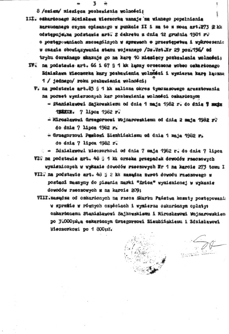 Jednak wbrew dotychczasowym opiniom, aresztowanie nie nastąpiło w dniu manifestacji, ale kilka dni później. Za współorganizowanie tej manifestacji, zostałem aresztowany w dniu 5.05.1982 r. Za rozbudzanie niepokojów społecznych, oraz za kolportaż ulotek, zostałem skazany na 1 rok pozbawienia wolności. Wyrok odsiadywałem w Koszalinie, Szczecinku i po uprawomocnieniu się wyroku we Wrocławiu. Po odbyciu 2/3 kary, w dniu 12 stycznia 1983 r. zostałem warunkowo zwolniony. Represje wobec najaktywniejszych uczestników manifestacji nie zakończyły się na wyrokach, ale trwały także w okresie późniejszym. Zdzisław Wieczorek po wyjściu z więzienia i kontynuowaniu działalności podziemnej, został w końcu zmuszony do emigracji. Grzegorz Ziembiński w październiku 1983 r. został powołany do wojska i jako "element wywrotowy" skierowany do karnej jednostki wojskowej w Orzyszu.