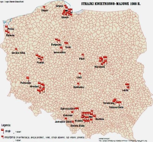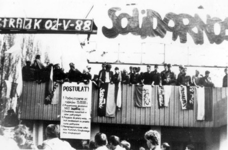 Wybrzeże 1988. Strajki majowe.W drugiej połowie kwietnia 1988 roku doszło do fali protestów. Jako pierwsi zastrajkowali pracownicy komunikacji miejskiej w Bydgoszczy - 25 kwietnia, dzień później Huta im. Lenina w Nowej Hucie, a 29 kwietnia - huta w Stalowej Woli. Na Wybrzeżu strajkowała przez dziewięć dni (2-11 maja) Stocznia Gdańska oraz kilka dni studenci z Niezależnego Zrzeszenia Studentów. Wspomagali ich działacze FMW, WiP oraz wielu innych niezależnych organizacji. To właśnie przedstawiciele młodego pokolenia, któremu była obca obojętność starszych działaczy "Solidarności", jak i strach przed reżimem komunistycznym, zorganizowali te strajki.