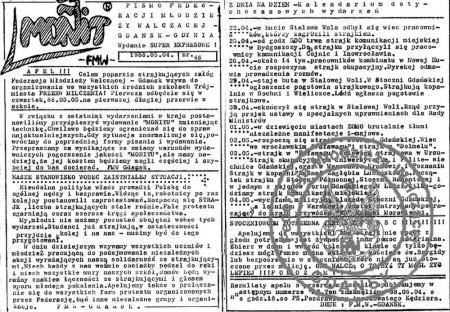 Warto przypomnieć, że w strajku w stoczni uczestniczyła także mocna ekipa FMW związana z kibicami Lechii Gdańsk ze śp. Tadeuszem Duffekiem na czele W maju strajkująca stocznia otrzymała od "biało - zielonych" kibiców potężne wsparcie w dniu 7 maja podczas meczu z Górnikiem Wałbrzych. Najpierw fani Lechii na stadionie przez 90 min. skandowali "Stocznia Gdańska!" i inne solidarnościowe okrzyki. Następnie kibice z tzw. młyna, pod hasłem "Bić gestapo!" wykrzykiwanym przez cały stadion, prowadzili na trybunach regularną bitwę z ZOMO. Po meczu zaś cały ten tłum ruszył pod stocznię tocząc po drodze wielogodzinne walki z milicją. Lechistom udało się dotrzeć do stoczni i wspólnie ze strajkującymi robotnikami skandowali do późnych godzin wieczornych wolnościowe hasła. Grupy Pomocy StrajkowejDziałacze WiP byli pomysłodawcami powstania zorganizowanej pomocy i wsparcia dla strajkujących, na bazie salki katechetycznej kościoła św. Brygidy w Gdańsku. Mówi Klaudiusz Wesołek, działacz WiP: W ten sposób ruszyły Grupy Pomocy Strajkowej, jak nazwaliśmy naszą akcję wspomagającą. Zaraz dołączyli do nas koledzy z FMW. Część z nich już wcześniej wylądowała w stoczni, gdzie uruchomili mini-drukarnię. Wkrótce druga mała drukarnia ruszyła w "Brygidzie". Rozpoczęliśmy też zbiórkę żywności i innych potrzebnych rzeczy dla stoczniowców. Starsi ludzie okazali się bardzo hojni. Ale wręcz zadziwiające było zaangażowanie młodych ludzi w przenoszenie pomocy na teren stoczni. Stocznia była otoczona kordonem ZOMO, ale młodzi ludzie zawsze znaleźli sposób, aby się tam dostać. Na początku w akcji brała młodzież z WiP i FMW oraz innych organizacji opozycyjnych. Później pojawiało się coraz więcej młodych ludzi, nigdzie dotąd nie zaangażowanych...