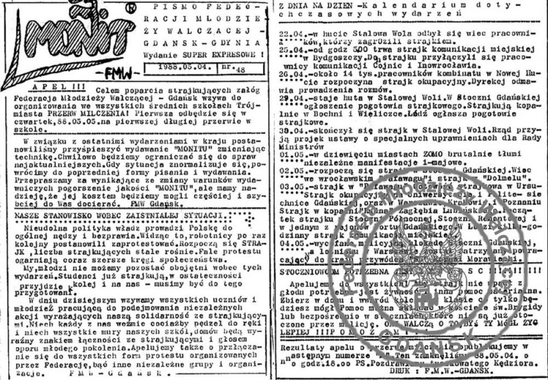 Federacja wspierała stoczniowe protesty także drukując ulotki i prasę strajkową poza stocznią. "Monit" - pismo FMW Gdańsk i Gdynia wydanie specjalne, stał się w tych dniach dziennikiem. Oprócz codziennej pracy przy druku "Monitu" młodzież z FMW uczestniczyła także w kolportażu i druku codziennej ulotki, sygnowanej przez Komitet Strajkowy w Stoczni, która była kolportowana w bardzo dużym nakładzie w Trójmieście. Ulotka powstawała w stoczni, ale diapozytywy szły na wszystkie zakonspirowane drukarnie w Trójmieście. Dokonywano akcji ulotkowych, malowania murów, pojawiały się także inicjatywy na rzecz strajkujących robotników i studentów w szkołach, jak przerwy milczenia (główna akcja tego typu odbyła się w trójmiejskich szkołach ponadpodstawowych 5 maja), niezależne apele, śpiewy pieśni patriotycznych. Uczniowie z Liceum Plastycznego w Gdyni ogłosili spontanicznie w dniu 4 maja pogotowie strajkowe. Wielu działaczy FMW codziennie angażowało się w pracę kurierów, podtrzymując łączność i donosząc wsparcie dla strajkujących. Olgierd Buchocki jako oficjalny przedstawiciel FMW dołączył do strajkujących studentów na UG i PG. Wspomina Grzegorz Bonk, działacz FMW i członek Związku Harcerstwa Rzeczpospolitej: Nadzieję podtrzymał strajk studencki. Na wezwanie Jana Pastwy, drużynowego naszej "Czarnej Czwórki" wieziemy kuchnię polową na "Humanę". Taka była widać nasza rola, żeby zapewnić logistykę, dla tych, którzy mieli wtedy przywilej strajkować. Z tego przywileju niewielu odważyło się skorzystać. Tym większa chwała tym, co dali świadectwo, zwłaszcza młodemu pokoleniu stoczniowców...