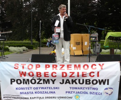 Impreza "STOP przemocy. Pomóżmy Jakubowi" odbyła się pod honorowym patronatem Międzynarodowej Kapituły Orderu Uśmiechu. Organizatorami festynu byli: Komitet Obywatelski Miasta Koszalina, Stefan Romecki - kawaler Orderu Uśmiechu, Towarzystwo Przyjaciół Dzieci, Oddział Okręgowy w Koszalinie, Centrum Kultury 105, Miejski Ośrodek Pomocy Spoecznei i policja. Przygotowali oni atrakcje dla dorosłych i dzieci. Były lody za darmo, kiełbaska z grilla, wata cukrowa, ciasta, różne konkursy i występy lokalnych zespołów. Podczas festynu kwestujący zebrali 4.407 zł. 6 tys. przekazała Fundacja Espersen, a 500 zł dało prywatne centrum rehabilitacyjne, w którym leczy się Kubuś. - Warto zapobiegać przemocy, szczególnie wobec najmłodszych - deklaruje Leszek Jęczkowski, dyrektor Ośrodka Adopcyjno-Opiekuńczego w Koszalinie. - Niestety, w swojej pracy coraz częściej spotykamy się ze skrajnymi przypadkami znęcania nad dziećmi. W głowie się nie mieści, że można tak skrzywdzić dziecko. Stefan Romecki apelował do uczestników festynu: - Obudźmy serca i sumienia! Reagujmy na płacz dziecka za ścianą. Zwróćmy się o wsparcie do instytucji, które pomagają najmłodszym. - Przemoc ze strony dorosłych wobec dzieci istnieje do czasów najdawniejszych - przypomniał Henryk Jeszke, zachodniopomorski rzecznik praw dziecka przy Oddziale Okręgowym TPD. - Dopiero pod koniec XIX wieku dorośli zrozumieli, że dzieci też są ludźmi. Niestety, one często wciąż są ofiarami przemocy fizycznej, psychicznej i prenatalnej. Co trzecia kobieta, która spodziewa się dziecka, pali papierosy, trując nie tylko siebie, ale i małego człowieka, który się rozwija. Datek na rzecz Kubusia dała m.in. Grażyna Leonowicz: - To jest dar serca, temu chłopcu trzeba pomóc. Ewa Marczak