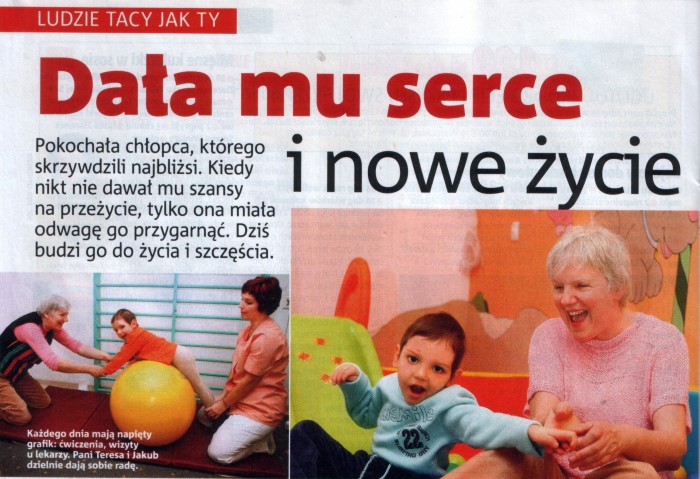 LUDZIE TACY JAK TY Dała mu serce i nowe życie Pokochała chłopca, którego skrzywdzili najbliżsi. Kiedy nikt nie dawał mu szansy na przeżycie, tylko ona miała odwage go przygarnąć. Dziś budzi go do życia i szczęścia. Miłość jest silniejsza od śmierci. Teresa Miotk święcie w to wierzy, kiedy patrzy na Jakubka. Niedawno skończył 4 lata. Ona wkrótce zdmuchnie na torcie 60 świeczek. I modli się o jedno - żyć jak najdłużej dla tego chłopca. W Koszalinie, gdzie mieszka, ludzie mówiąc niej albo "święta", albo "szalona". Bo choć nie musiała, podporządkowała swój świat Jakubkowi. Jest pewna, że to przeznaczenie postawiło go na jej życiowej drodze i już nie wyobraża sobie kroczenia nią dalej bez chłopca. By ją zrozumieć, trzeba cofnąć się o trzy lata. - Właśnie wtedy Jakubek trafił do szpitala... - Teresa tuli chłopca na kolanach. - Słyszała o tym chyba cała Polska. Miał pękniętą czaszkę, obrzęk mózgu. Umierał... Skatował go tak konkubent jego matki. Prokurator ustalił, że siłą "usypiał" chłopca. Bił go pięścią, gdy maluszek (Jakub miał wtedy zaledwie roczek!) nie mógł zasnąć i płakał. Ci, którzy widzieli malutkiego Jakuba w szpitalu, do dziś nie mogą zapomnieć widoku jego posiniaczonego ciałka, gąszczu rurek i przewodów maszyn podtrzymujących dziecko przy życiu. Lekarze nie dawali nadziei na przeżycie, ale walczyli. - Dowiedziałam się o Jakubie i stało się coś przedziwnego - opowiada Teresa. - Jakaś siła kazała mi pójść do szpitala, pomóc temu dziecku. Czułam, że muszę to zrobić. Jej życie przewróciło się do góry nogami Żyła wtedy ze skromnej emerytury, działała społecznie. Nie miała żadnych zobowiązań i mogłaby całymi dniami odpoczywać po latach pracy w nauczycielskim fachu. Ale... - Musiałam działać - opowiada. - Wybłagałam lekarzy i biologiczną babcię Jakuba, żeby pozwolili mi go zobaczyć, a potem czuwać przy jego łóżeczku. Jak go pierwszy raz zobaczyłam, serce zabiło mi mocniej. Czutam jego ból, cierpienie. I nabrałam pewności, że od tej pory będę go wspierać i chronić. Najlepiej, jak tylko potrafię, zastąpię mu matkę. Stworzę mu nowy dom, nowe życie. Nawet kiedy stan chłopca nagle się pogorszył, ona wierzyła, że będzie dobrze. że razem wyjdą ze szpitala. - Tydzień trwała walka o życie - opowiada. - Jakubek przeżył, ale z masą schorzeń, które były wynikiem urazów, m.in.: czterokończynowym porażeniem mózgowym, paraliżem jednej strony ciała, uszkodzeniem wzroku oraz zaburzeniami równowagi. Specjaliści mówili, że będzie półrośliną, bo już nic nie postawi go na nogi. Wiara Teresy była silniejsza niż diagnozy lekarzy. Złożyła wniosek o przyznanie jej praw rodzicielskich. Sama nie wie, jak udało się jej przekonać sąd. Ale ten cud był niczym w porównaniu z kolejnymi. - Od tej pory liczył się tylko on - mówi Teresa. - Wiedziałam już, co znaczy opiekować się kimś przez całą dobę. Gdy miałam 13 lat, zmarła mi mama i przygarnęła mnie ciocia. A gdy ona zachorowała, przez 27 lat troszczyłam się o nią. Nie miałam czasu na własne dzieci. Musiały wystarczyć mi te, które wychowywałam i uczyłam w szkole. A teraz, po latach, zostałam taką trochę spóźnioną mamą. Chciała jak najszybciej rehabilitować Jakubka. Wydreptała kilometry ścieżek w poradniach i szpitalach, wydzwaniała do specjalistów, a jej domowa biblioteka zapełniła się medyczną literaturą. - Szukałam każdej informacji na temat leczenia dzieci po urazach - opowiada. - Załatwiałam dojazdy na zabiegi, opiekę fachowców. Wiedziałam, że im więcej troski mu zapewnię, tym szybciej będzie wracał do zdrowia. Czasem mokra z wysiłku, wyczerpana, słyszała od innych: "Po co pani to robi? To przecież nie pani dziecko?". "Już moje", odpowiadała i wracała do pracy. Po miesiącach harówki przyszły chwile, gdy zobaczyła jej sens. - Jakub był coraz silniejszy - opowiada. - Zaczął się podnosić, próbował wstawać, chodzić. Każdy jego ruch był dla mnie wydarzeniem. Jak zrobił pierwszy krok, skakałam do góry ze szczęścia. Byłam wniebowzięta. Na jego twarzy zaczął pojawiać się uśmiech, a w dniu, kiedy jeszcze niewyraźnie powiedział do mnie "Terenia", aż się popłakałam. To dodawało jej sił do pracy. Jak lew walczyła o to, co dla niego najlepsze. Nie wahała się błagać znajomych i obcych ludzi o pomoc dla dziecka. - Dla niego żebrałabym nawet pod kościołem - Teresa nie wstydzi się mocnych słów. - Ale na szczęście dobrzy ludzie nie zawiedli. Jakubek dostał wsparcie od fundacji "Pat-Kub", przyjaciół i zupełnie nieznanych mi darczyńców. Teraz liczy się dla niej tylko szczęście dziecka Tak wielu ludzi się zaangażowało w pomoc, że Jakub stał się rozpoznawalny w Koszalinie. Gdy szedł z Teresą, przechodnie dziękowali jej za to, co robi. Ze łzami w oczach patrzyli na zoperowaną główkę malca, z dziurą w czaszce, którą chronił kask. - Byłam wzruszona szczególnie wtedy, gdy odzywali się moi uczniowie - opowiada. - Na "Naszej Klasie" poprosiłam o pomoc. Jedna z uczennic skontaktowała mnie błyskawicznie z neurochirurgiem z Warszawy. Pojechała do niego i okazało się, że gdyby zwlekała, mogłoby się to skończyć dla Jakuba nawet śmiercią. Płytka zastępująca kości czaszki naciskała na mózg. Kolejna operacja, nerwy i... radość, że się udało. Powrót do ćwiczeń, terapii. Kask poszedł w kąt. Uśmiech na twarzy Jakubka wrócił. - Jak kogoś kochasz, cieszysz się jego szczęściem bardziej niż własnym - mówi Teresa. - To dawało mi napęd do życia i poczucie sensu. Teresa sama się dziwi, jak szybko zleciały jej już trzy lata opieki nad Jakubkiem. O jego wieku przypomina jej duży napis na szafie w pokoju: "Jakub ma już 4 lata!". - Zrobiliśmy go z przyjaciółmi na poprzednie urodziny i teraz tylko muszę wymieniać czwórkę na 