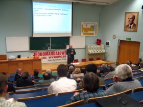 bez pytania o inne sprawy. Nasz program jest jednopunktowy: Jednomandatowe Okręgi Wyborcze. Tylko tyle i aż tyle! Nie mówimy o kwestii Unii Europejskiej, aborcji, nie kłócimy się o to jak rozwiązać problem rolników czy hutników, nie dyskutujemy o Balcerowiczu, karze śmierci i innych ważnych kwestiach. Pozwalamy by każdy z uczestników naszego Ruchu miał na te tematy dowolne własne zdanie, ale my się tymi sprawami nie zajmujemy, nie dlatego, że lekceważymy te ważne zagadnienia, a dlatego, że uważamy iż trzeba najpierw zbudować fundament demokracji, a potem załatwiać różne bardzo ważne sprawy. Dzięki takiej postawie są wśród nas ludzie o orientacji proeuropejskiej i są przeciwnicy UE, są skrajni prawicowcy i członkowie SLD, są liberałowie i zwolennicy państwowej kontroli nad gospodarką. Ta różnorodność nam nie przeszkadza, wręcz przeciwnie - jesteśmy z niej niezwykle zadowoleni. Z radością witamy każdego, kto wiedząc, że trafia do niezwykle zróżnicowanego środowiska zgadza się zostawić na boku inne kwestie światopoglądowe, a działać na rzecz naprawy państwa polskiego. To jest bowiem wielka szkoła patriotycznego, wspólnego działania i właściwie pojętej tolerancji. W kraju gdzie partie żrą się i obrzucają błotem, w Obywatelskim Ruchu na rzecz JOW jest miejsce, w którym Polacy różnych orientacji i zapatrywań zgodnie działają dla wspólnego dobra. Czy może być lepsze i pożyteczniejsze działanie? I jeszcze jedno. Ruch na rzecz JOW nie jest partią, nie ma sformalizowanych władz, nie ma członkostwa. Działać w nim może każdy. Każdy może wziąć listę i zbierać podpisy pod wnioskiem o referendum, każdy może organizować spotkania na które chętnie przyjedziemy. Jesteśmy jak pospolite ruszenie złożone z wolnych woJOWników, którzy wyruszyli w pole nie pod przymusem i nie po partyjne łupy, ale w obronie Ojczyzny, przekonani o najwyższej słuszności sprawy, której służymy. Koszalińscy i pomorscy woJOWnicy zaliczani są do jednych z najaktywniejszych w kraju. Janusz Sanocki Janusz Sanocki woJOWnicy Nie byłoby Ruchu Obywatelskiego JOW, gdyby nie było woJOWników - ludzi, którzy bezinteresownie tłuką się po kraju, organizują spotkania, konferencje, bombardują prasę artykułami o konieczności zmiany systemu wyborczego. Ludzi, którzy poświęcając własny czas, własne pieniądze pracują nad wielką przemianą ustrojową państwa, tylko dlatego, że uważają, iż Polsce i Polakom ta przemiana jest po prostu niezbędna. Cała ta praca jest zupełnie bezinteresowna, wprowadzenie JOW niczego nikomu z nas nie gwarantuje, w JOW do Sejmu wystartować będzie mógł każdy, nawet dzisiejsi przeciwnicy tej zmiany. Nikt z nas nie otrzyma premii za to, że zmieni się system wyborczy. Nikt nigdy nam nie zwróci pieniędzy i czasu poświęconego tej sprawie. A jednak akcja na rzecz JOW wciąga jak nałóg. Co jest takiego w tym Ruchu, że po prostu jest frajdą uczestniczyć w kolejnych eskapadach, marszach, spać na podłogach, tłuc się po kraju? Może właśnie bezinteresowność, wolność, swobodny, własny wybór. Tu nikt niczego sobie nie załatwia i dlatego nie ma na naszych konferencjach i spotkaniach partyjnych wyjadaczy, którzy idą tam, gdzie pachnie stanowiskami. Rzadko kiedy pojawiają się "wybrańcy narodu" - posłowie.