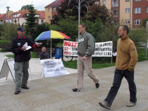 | | Rozdajemy ulotki JOW przed koszalińskim ratuszem. Na drugim planie widać nasz transparent z napisem: "Koszalin - my już to znamy. SLD - sitwokracja jednopartyjna. POPiS - sitwokracja wielopartyjna". |