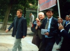 | | Koszalińscy działacze JOW - Czesław Dębiec i Tadeusz Wołyniec (drugi i trzeci od lewej) podczas manifestacji |