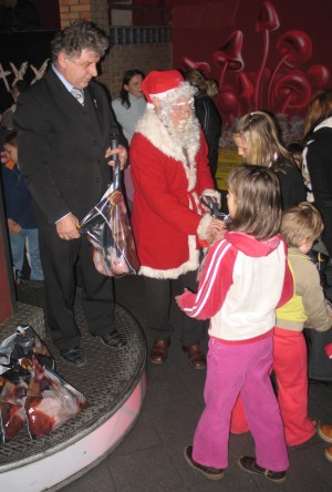 Wymieńmy nazwiska wszystkich tegorocznych wolontariuszy: Justyna Szyszko, Sylwia Pawlak, Marta Materna, Aneta Stachniuk, Ernestyna Sobczyk, Marysia Sobczyk, Katarzyna Wierzbicka, Kinga Skowrońska, Katarzyna Sowa, Anna Kowalska, Natalia Garbalska, Paulina Ciszewska, Izabela Ignaczak, Karolina Załucka, Paulina Jaciubek, Milena Kaca, Aleksander Rehlis (wszyscy z Zespołu Szkół Nr 8), Ewelina Mazurkiewicz, Kasia Mazurkiewicz, Agata Ziemniak (SP Nr 7), Luiza Stachur (SP Nr 1). Koszalinianie jak zwykle nie żałowali darów. Zebrano ich tyle, że wystarczy na zorganizowanie śniadania oraz obdarowanie paczkami 300 osób dorosłych i 50 dzieci. Już przed świętami 80 rodzin otrzymało paczki żywnościowe na święta. Ich zawartość jest bardzo urozmaicona: olej, cukier, mąka, ryż, kasze, makatony, konserwy, dżemy, margaryna, czekolada. Reszta darów trafi na świąteczxny stół i do paczek dla uczestników śniadania, w którym według przewidywań weźmie udział 200 osób dorosłych oraz 50 dzieci. Śniadanie odbędzie sie w pierwszy dzień świąt Bożego Narodzenia, we wtorek 25 grudnia o godzinie 11.00 w klubie "Bajka" przy ul. Władysława Andersa (obok dużej poczty). Jeszcze słów kilka o tych, którzy włączyli sie w organizację świątecznego śniadania. Zespół Szkół Nr 8 w Koszalinie przy ulicy Morskiej, to właściwie dwie szkoły w jednej - mieści się tutaj II Liceum Profilowane oraz Zasadnicza Szkoła Zawodowa Nr 2. Nauka w Liceum trwa 3 lata i kończy się maturą. Szkoła przygotowuje do pracy w branży turystycznej, gastronomicznej, kosmetycznej, handlowej oraz obsługi biura i ochrony mienia. Z kolei Zasadnicza Szkoła Zawodowa gwarantuje uzyskanie kwalifikacji w zawodach: sprzedawca, fryzjer, piekarz, cukiernik i inne. TORG, SANO I NETTO to popularne w Koszalinie sieci sklepów spożywczych, których właściciele i pracownicy nie ograniczają się do samej działalności gospodarczej, ale pamiętaja też o tych mieszkańcach miasta, którzy znaleźli się w potrzebie. Pamiętajmy, że tylko dzięki życzliwości tych osób - pedagogów, uczniów, handlowców - 300 dorosłych koszalinian i 50 dzieci będzie mogło spędzić święta Bożego Narodzenia w sposób godny i przeżywać je wspólnie. Serdecznie dziękujemy za ten dar serca! (ah) 2007-12-09 Paczki dla małych i dużych Pod takim tytułem największy dziennik Pomorza Zachodniego "Kurier Szczeciński" z 7 grudnia 2007 zamieścił relację z mikołajkowej akcji Stefana Romeckiego i KOMK. Koszalin. Jak wiele miast w Polsce, również Koszalin ma swój "trójkąt bermudzki". Do takich miejsc, jak leżąca tam ul. Kolejowa, z wielką niechęcią zagląda nawet policja. Ale nie święty Mikołaj i jego stały asystent Stefan Romecki, kawaler Orderu Uśmiechu. Jak co roku, stawili się punktualnie w południe i od razu zostali obstąpieni przez dzieci i dorosłych.