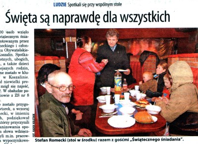 Głos Koszaliński pisze: Ponad 200 osób wzięło udział w "Świątecznym śniadaniu" przygotowanym przez Stefana Romeckiego i członków Komitetu Obywatelskiego Miasta Koszalin. Spotkanie dla samotnych, ubogich, bezdomnych, a także dzieci z najbiedniejszych rodzin, zorganizowane zostało w klubie "Bajka" w Koszalinie. Każdy dostał niewielki prezent, każdy mógł się najeść, porozmawiać. W obsłudze pomagali uczniowie z ZS nr 8 w Koszalinie.