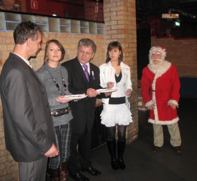 Od lewej: Tadeusz Rębisz - przewodniczący KOMK i Stefan Romecki w asyście Mikołaja i Śnieżynek rozpoczną za chwilę składanie życzeń świątecznych przybyłym Gościom.