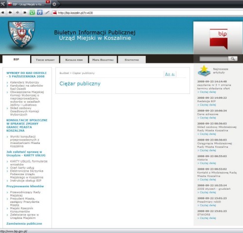 | Widok Biuletynu Informacji Publicznej koszalińskiego Urzędu Miejskiego (BIP Urzędu Miejskiego) w dniu 23.09.2008. Katalog z informacją o zadłużeniu miasta jest pusty. Interwencja radnego Stefana Romeckiego została zlekcewazona. |