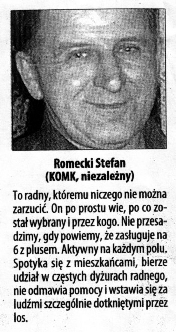 Takie osoby raczej nie kupują gazet. Myślę, że głosy oddane przez Czytelników dziennika Miasto, za które serdecznie dziękuję, są nie tyle poparciem dla osoby Stefana Romeckiego, co poparciem dla tych ideałów i wartości, które z wielkim trudem i wbrew wszelkim przeszkodom, staramy cię wcielać w życie. Odbieram to również jako sygnał skierowany do mnie wprost: masz dalej robić to, co robisz, nie zniechęcać się i nie szukać pretekstu do zaprzestania tej działalności. Widzę to przede wszystkim w kategoriach obowiązku. Zaufanie ze strony społeczeństwa jest czymś pięknym, ale kiedy pomyślę, że mógłbym ludzi zawieść, czuję jak ciarki chodzą mi po grzbiecie. To jest ogromny ciężar odpowiedzialności, żeby nie zawieść czlowieka, który w ciebie wierzy, który oczekuje od ciebie pomocy. Czasami nie ma z czego dawać i to bardzo boli. Dlatego przyjmę z wdzięcznością wyróżnienie, ale zapewniam, że w głowie mi się nie przewróci. Traktuję to jako zachętę do dalszej pracy wśród najbardziej potrzebujących.